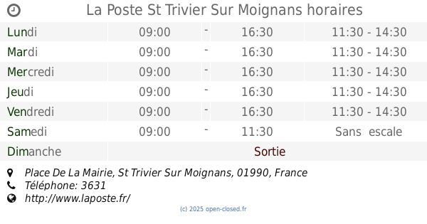 Add it to your website, your phone or even your desktop - opening times, phone numbers and the road to Branche of the La Poste Dans St Trivier Sur Moignans, Place De La Mairie.